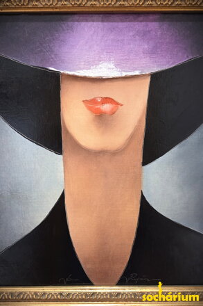 Obraz „Emma II" z roku 2025 je dielom, ktoré priamo žiari eleganciou. Minimalistická ženská postava skrytá pod širokým klobúkom necháva vyniknúť jemný detail pier, čím autor dokazuje, že skutočná elegancia vzniká z jednoduchosti a presne zvoleného akcentu.